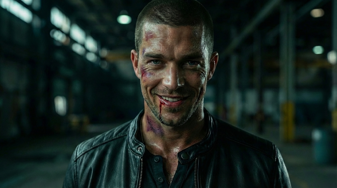 This short cinematic clip is part of an AI-generated video experiment exploring character dialogue, action timing, and dark humor in short-form storytelling. The scene takes place inside a gritty industrial warehouse where a man tied to a chair calmly narrates his situation while punches unexpectedly enter the frame from both sides.